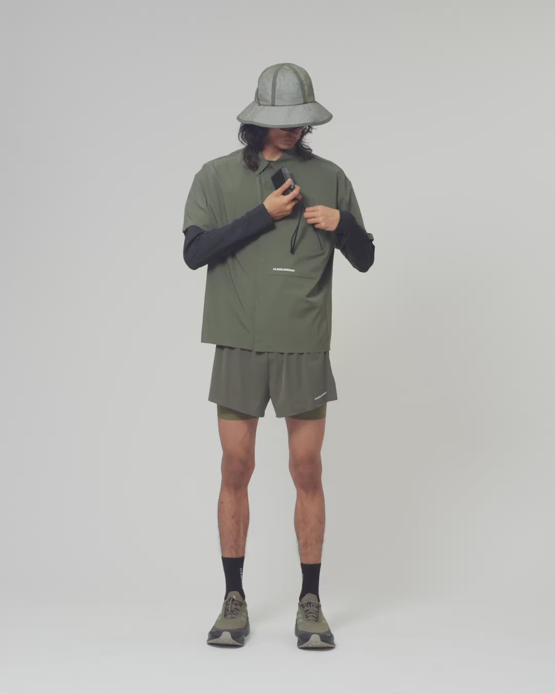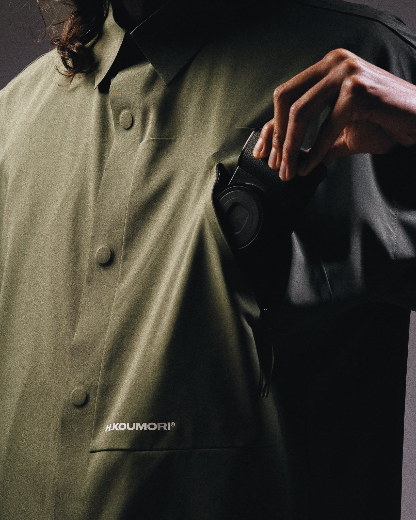 The Camp Shirt in Beetle is a lightweight, boxy-fit layer designed for movement and everyday wear. Crafted from a breathable stretch fabric, it offers comfort and ease while maintaining a clean, structured silhouette. The front button closure enhances versatility, and a discreet zippered pocket provides secure storage for small essentials. Finished with minimal Hermanos Koumori® branding, it balances technical function with refined simplicity.